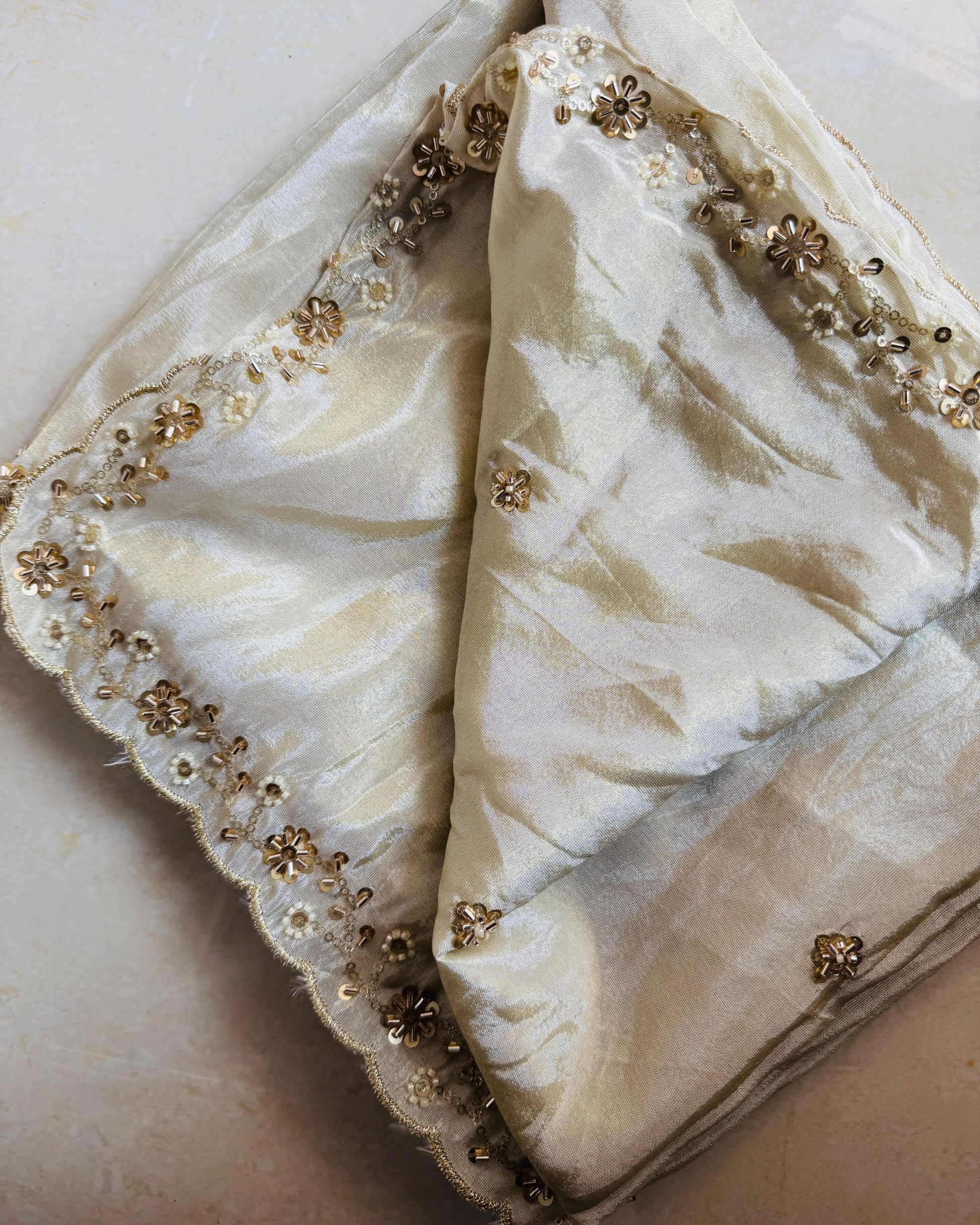 Bring timeless elegance to your ethnic wardrobe with this luxurious golden tissue dupatta beautifully decorated with handcrafted beads work. Its subtle shine and delicate detailing make it a perfect choice for weddings, festive functions, parties, and bridal looks.