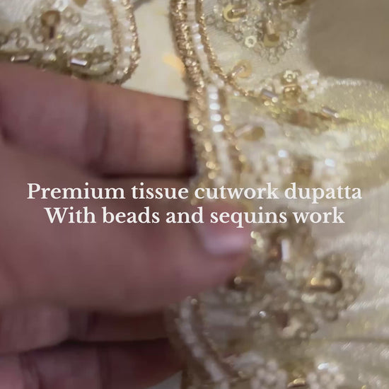 Golden Tissue Dupatta showcasing a handcrafted look with beads and zari work. The shimmering golden tissue fabric paired with fine detailing gives it a luxurious appeal, perfect for elevating both traditional and modern outfits.