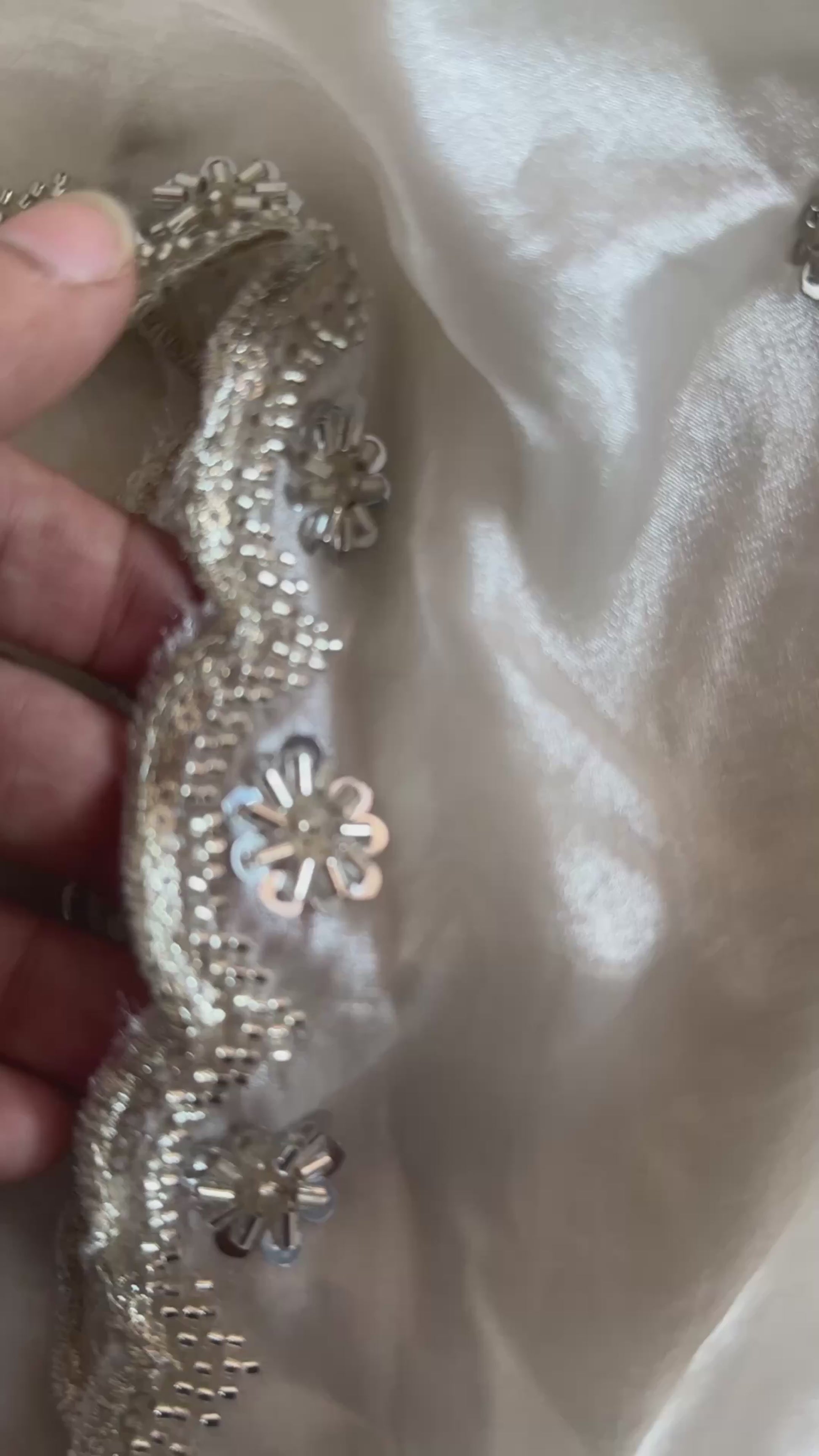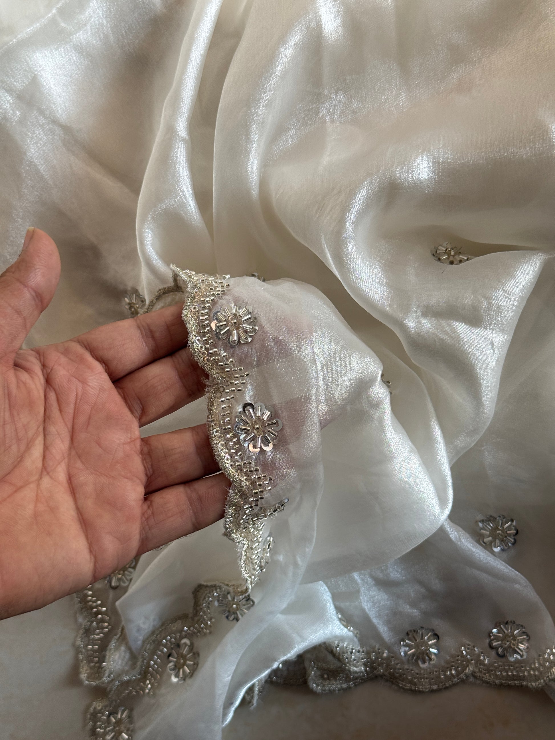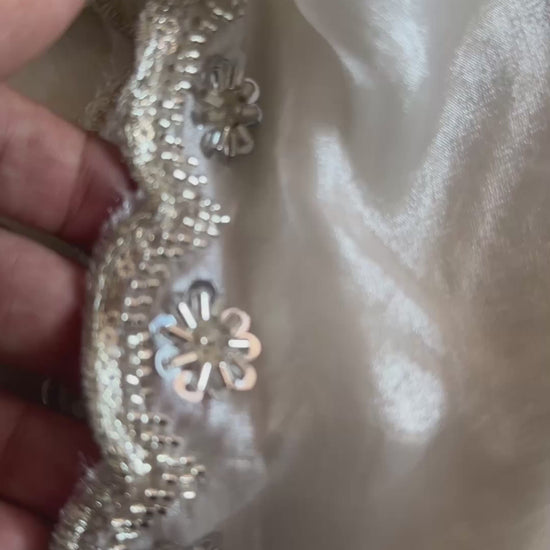 luxurious Off White Dupatta crafted in premium Fendi silk fabric. Adorned with delicate silver beadwork, this dupatta exudes elegance and sophistication, making it a perfect choice for weddings, festive occasions, and evening parties.
