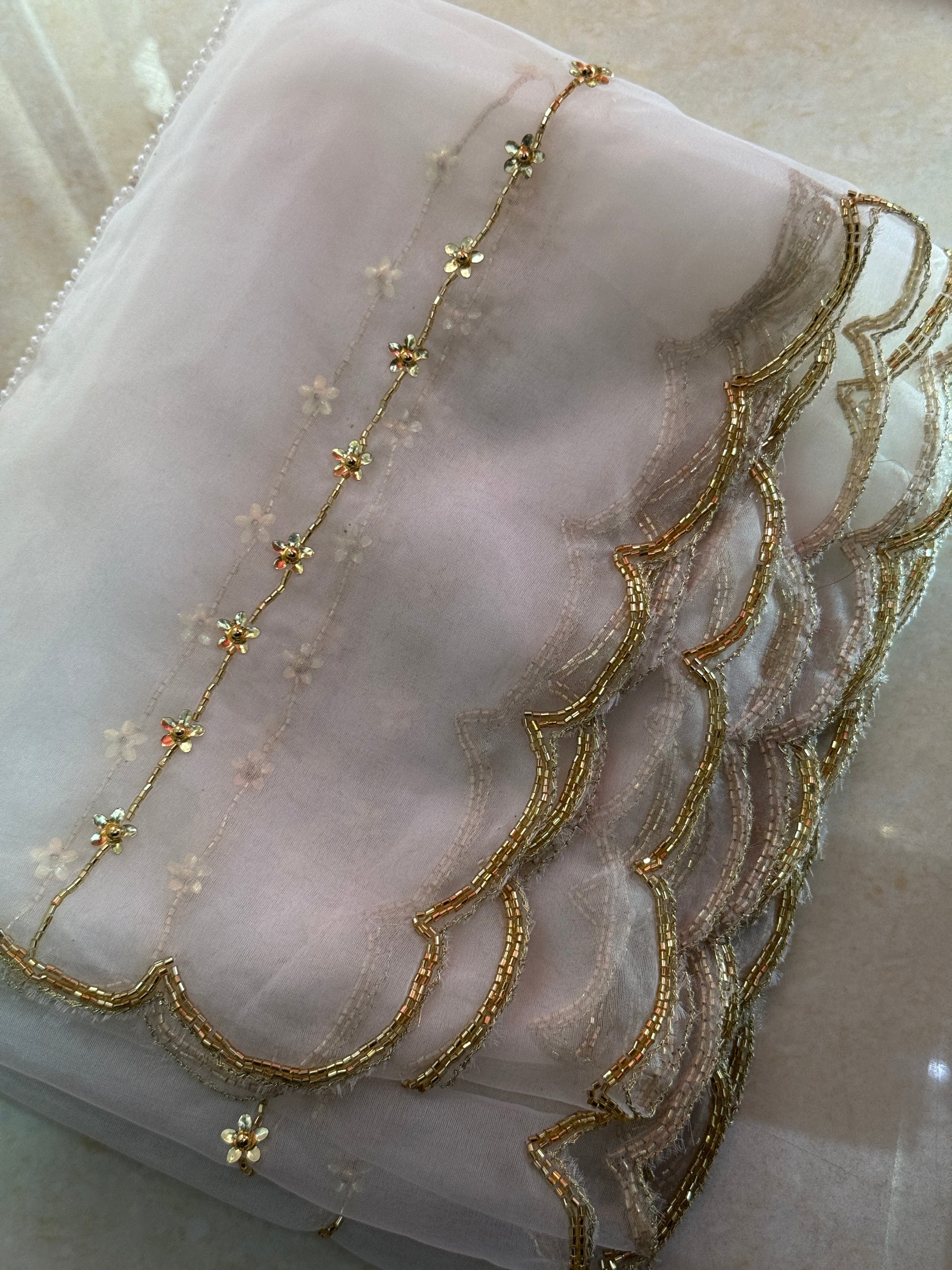 Organza Dupatta with Golden Beads & Pearl Work | Elegant Handmade Ethnic Dupatta