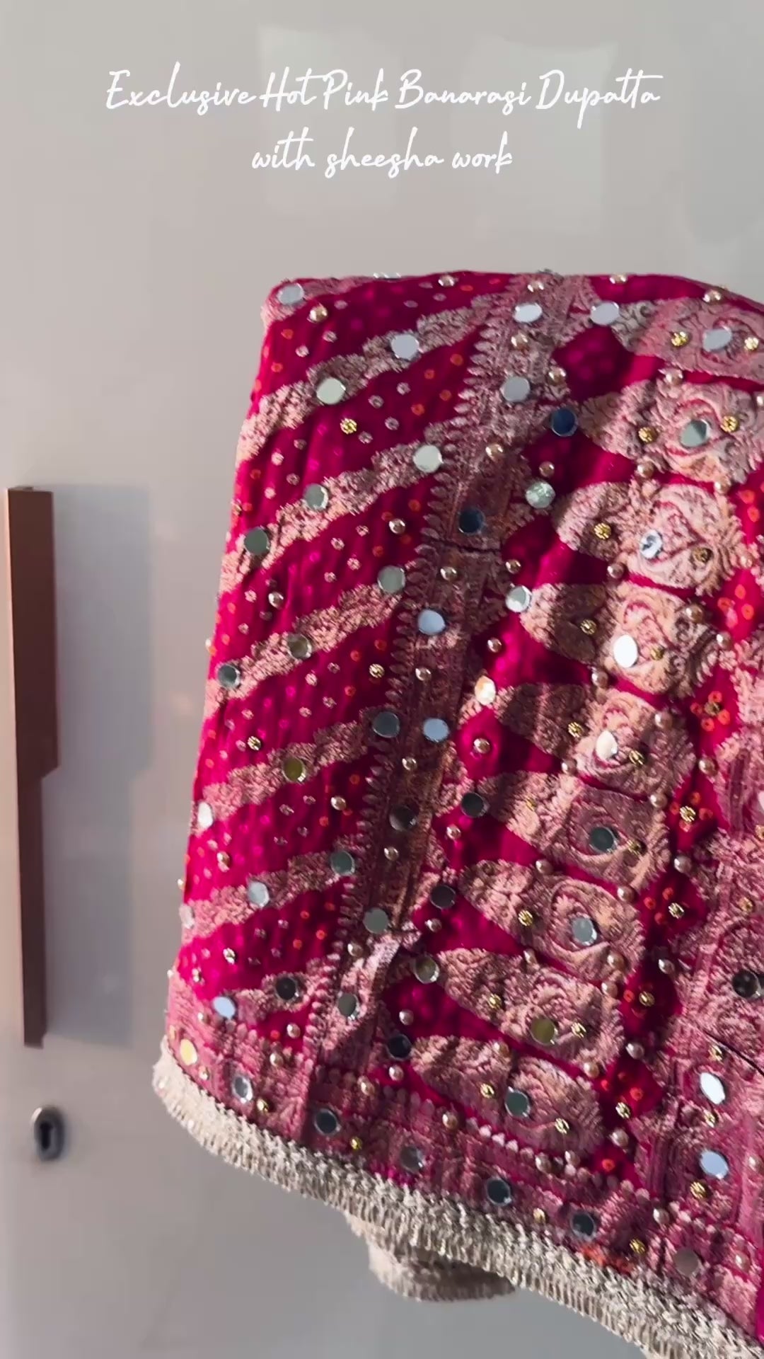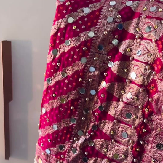 Pink Banarasi georgette dupatta featuring real mirror work and fine stone embellishment. Lightweight, soft fabric with rich Banarasi detailing. Length is 2.4 meters, suitable for festive, party, and wedding wear.