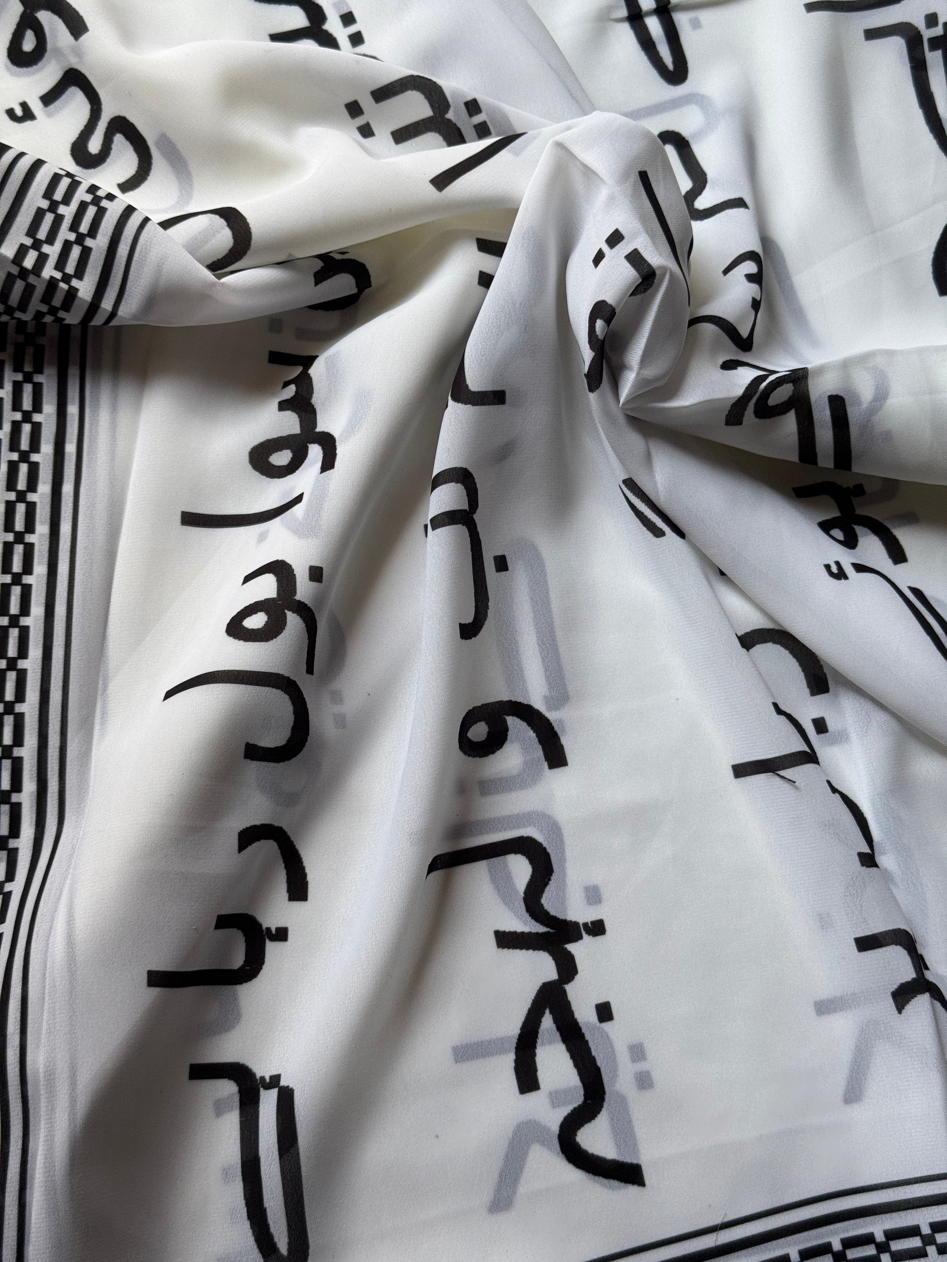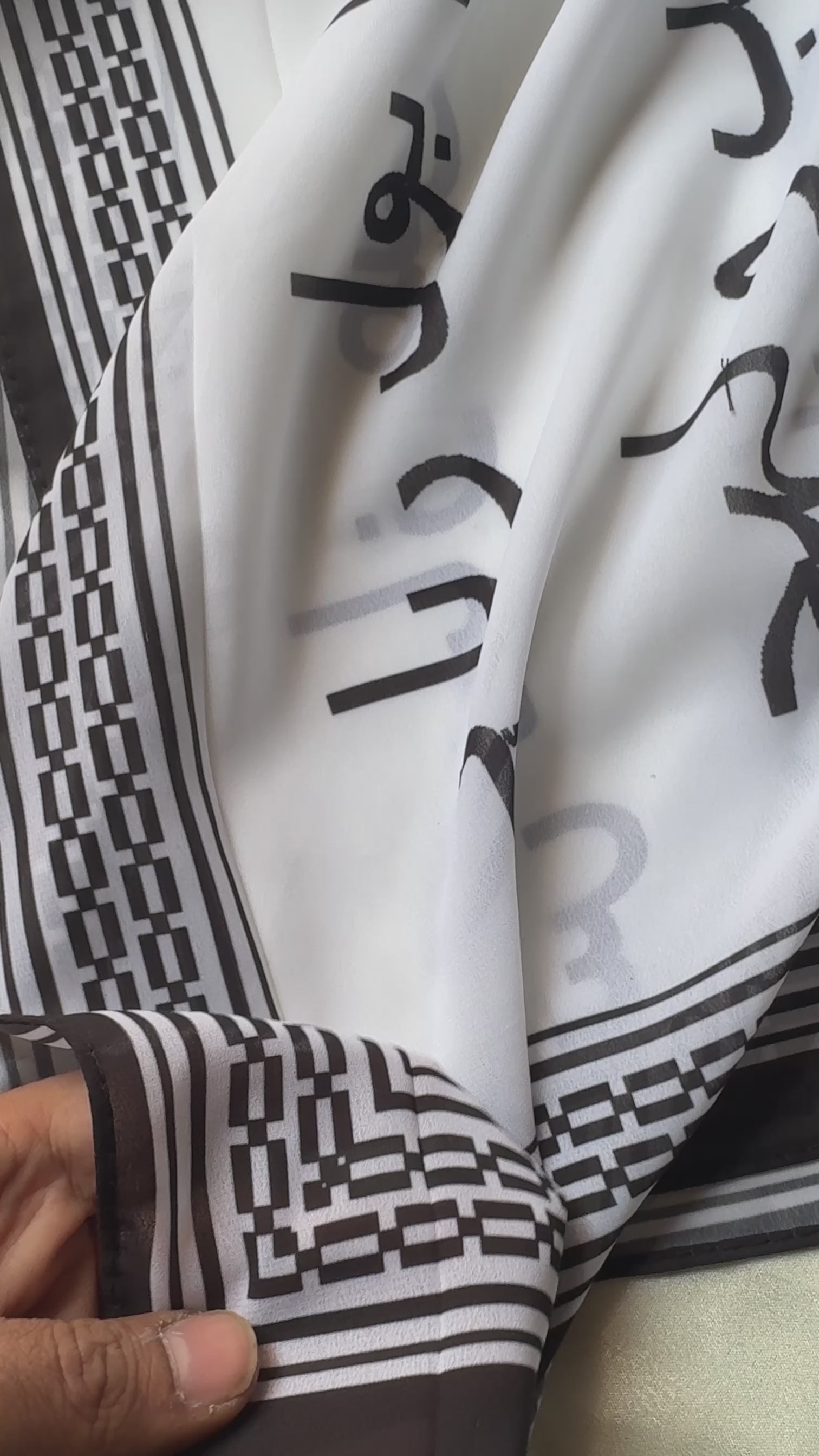 White & Black Georgette Printed Scarf. Designed with beautiful Urdu shayari print, this lightweight scarf perfectly blends culture and style. Measuring 1.7 meters in length and 25 inches in width, it’s ideal for both casual and festive wear.