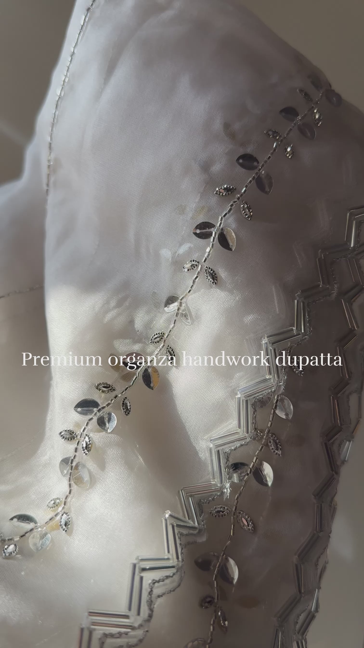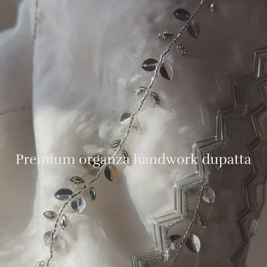 Crafted from premium-quality organza, this dupatta showcases delicate hand embroidery and fine detailing, giving it a graceful, luxurious appeal.